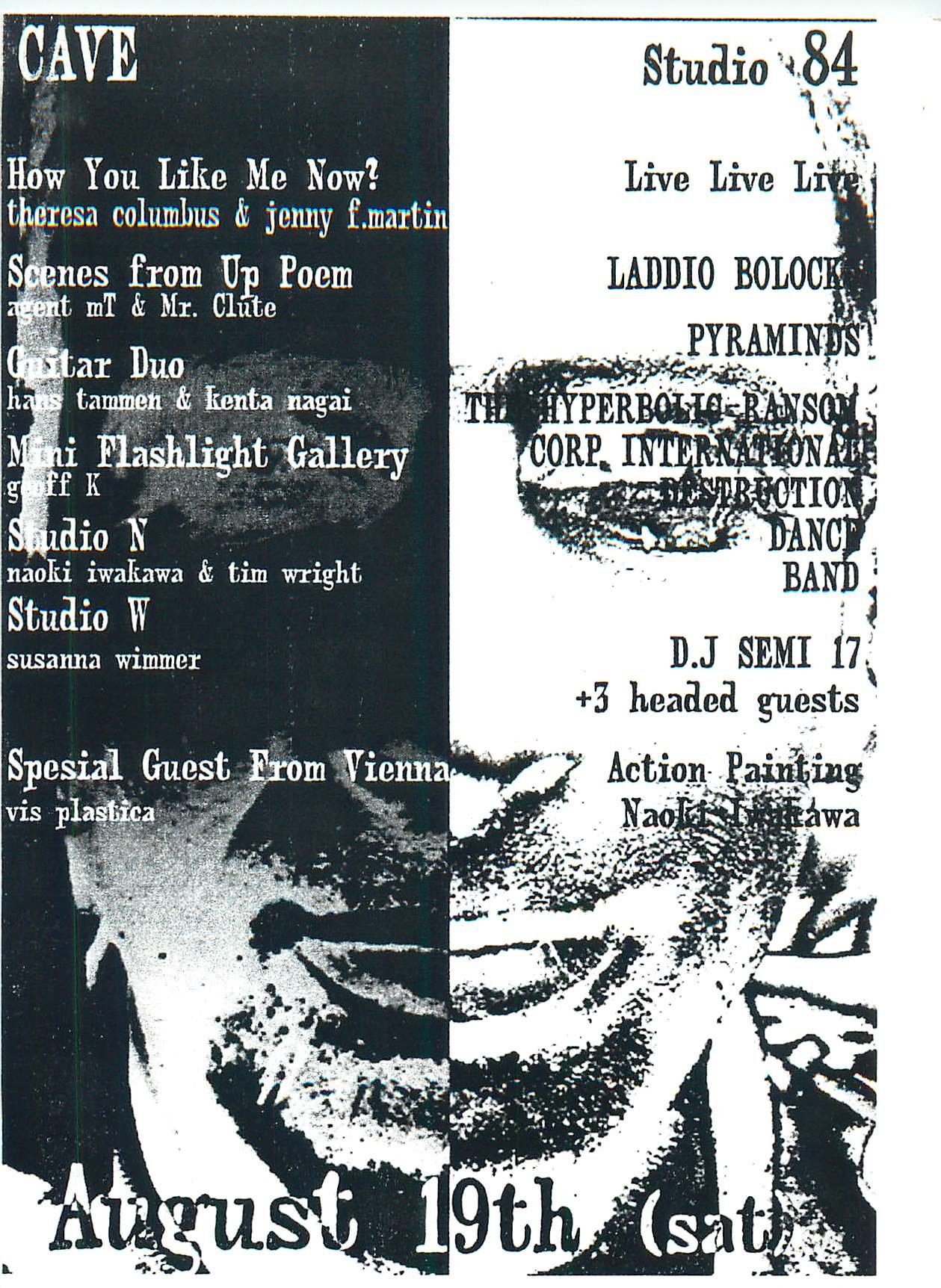 “How Do You Like Me Now?” was an exhibition at CAVE curated by LEIMAY’s Artistic Co Director and interdisciplinary artist Shige Moriya featuring Theresa Columbus & Jenny F. Martin, “Scenes from Up” with a poem by Agent mT & Mr. Clute, guitar duo Hans Tammen & Kenta Nagai, and “Mini Flashlight Gallery” by Geoff K in the main studio.