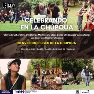 Laboratorio Creativo de Videodanza y Pedagogía Comunitaria llamado “Los seres que habitan Chupqua”, proyecto que hace parte de la Residencia Itinerante “Rituales de Extinción: Imaginarios Colectivos y Futuros Posibles”; a su vez propuesta ganadora de la “Beca Bogotá Econsciente”, bajo la RESOLUCIÓN No. 367 DE 2 DE JUNIO DE 2023 del programa Distrital de Estímulos 2023 de la Secretaría Distrital de Cultura, Recreación y Deporte. En él se exploró a través del movimiento, la videodanza y la pedagogía ambiental para visibilizar las problemáticas del Humedal (que acontecen a la mayoría de cuerpos naturales en la ciudad de Bogotá) con un enfoque en el trabajo colectivo y comunitario. Se realizó en 7 sesiones sábados y/o domingos de 8am-12pm, a través de talleres artísticos y trabajo colectivo.