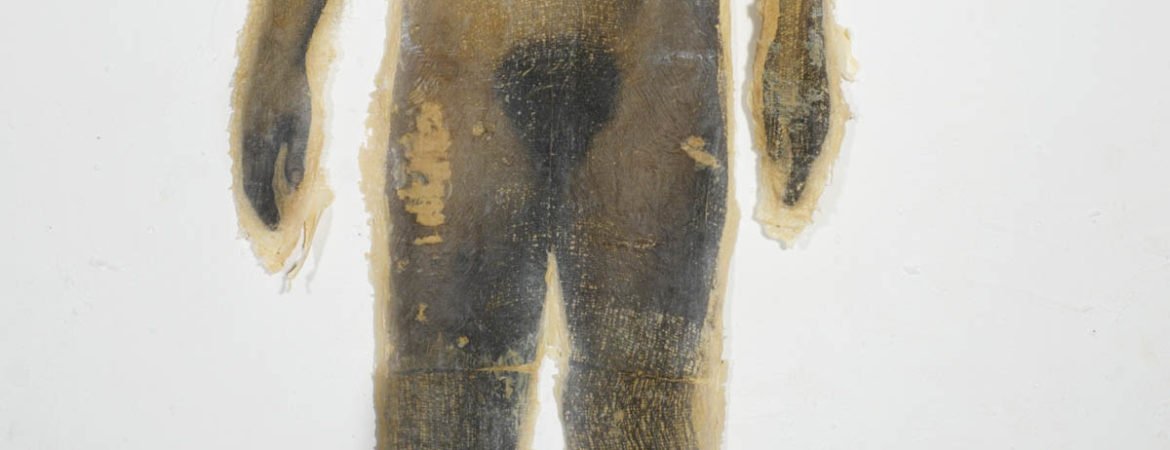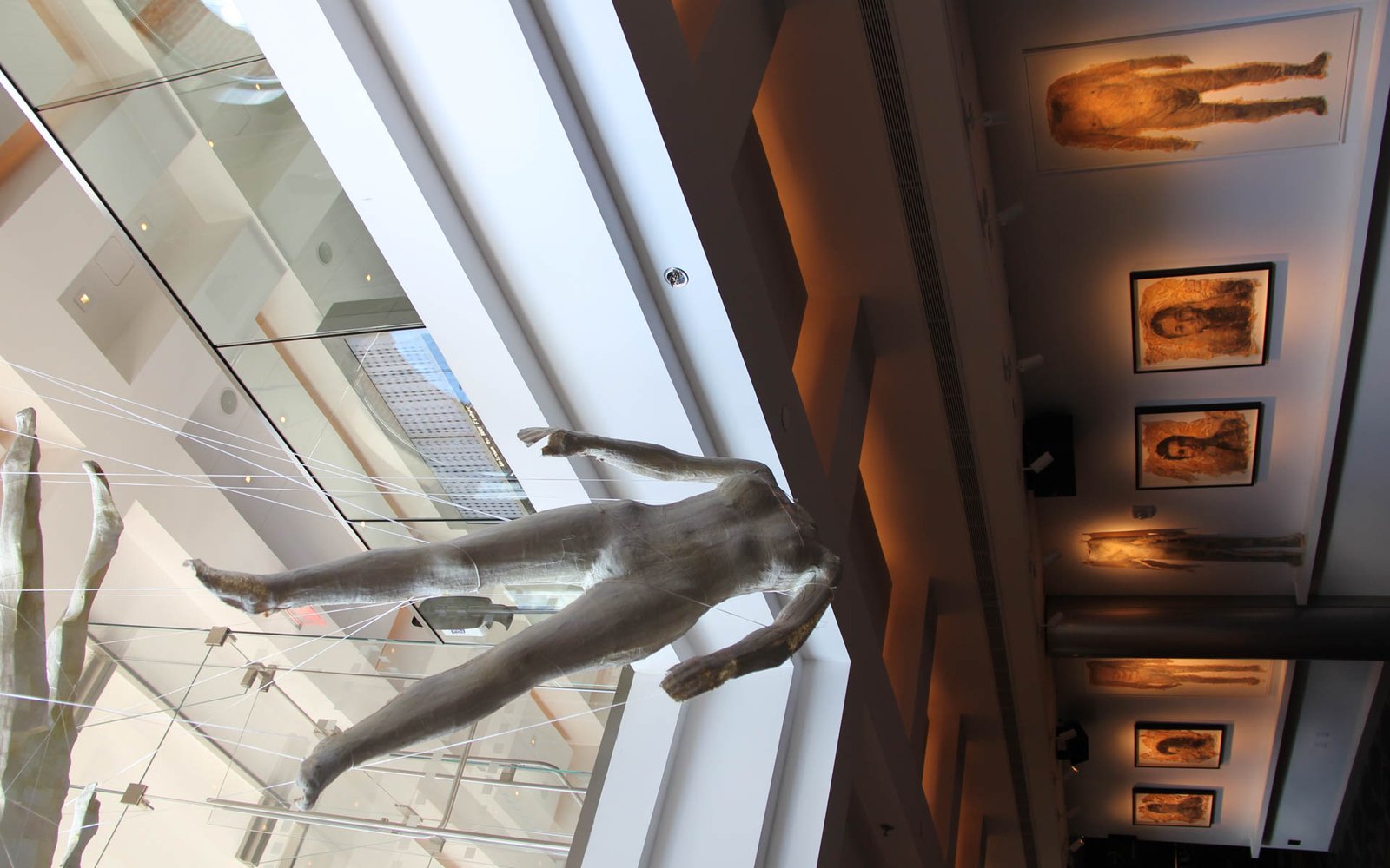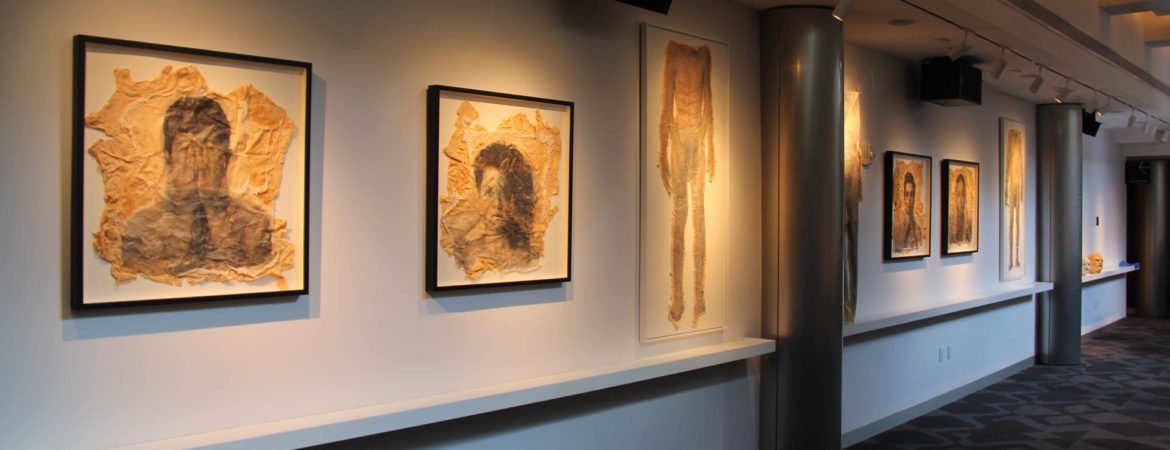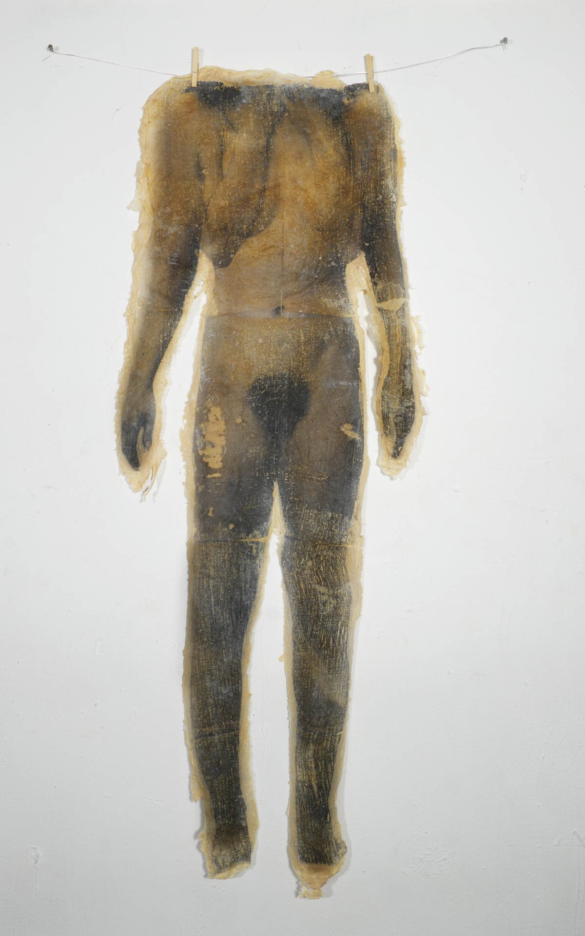 Becoming –Corpus Exhibition features re-purposed historical fragments of earlier iterative processes as well as leftover detritus of the creative process. Photographed bodies are printed onto latex skins from previous works by Garnica and Moriya. The skins are beheaded, on display not far from sculptures of the dancers’ heads, maybe in souvenir to a whole body. Other objects included are molds of Garnica and Moriya’s whole bodies entangled in string, appearing to hover in the air but also to anchor one’s vision. They use tension and suspension to conflate a sense of expansion and collapse of space. The same sense of dislocated space echoes the derangement of order in the choreography of Becoming –Corpus. The exhibition runs concurrently with the Becoming –Corpus stage production, functioning as both an independent exhibition and a complementary component of the project.