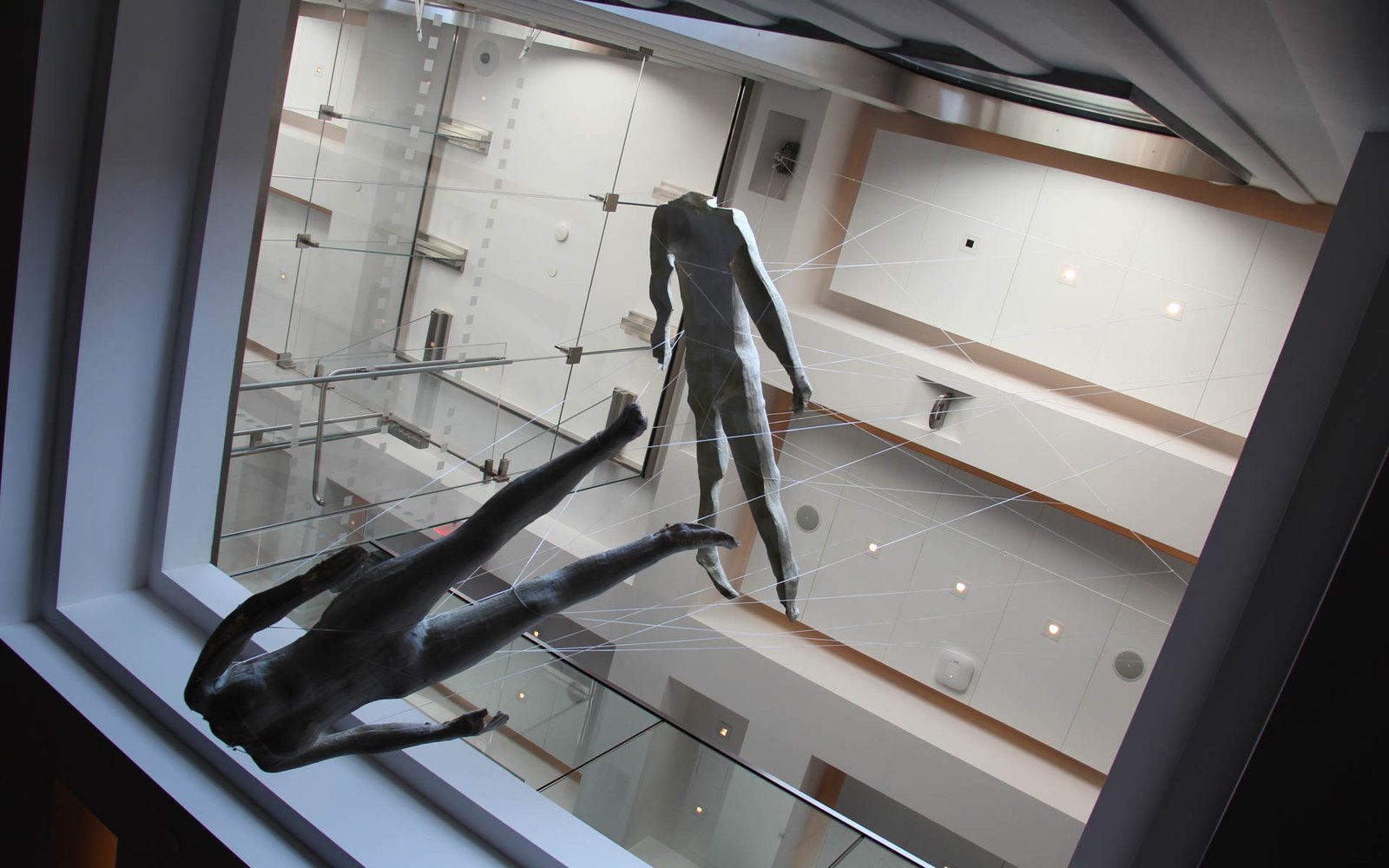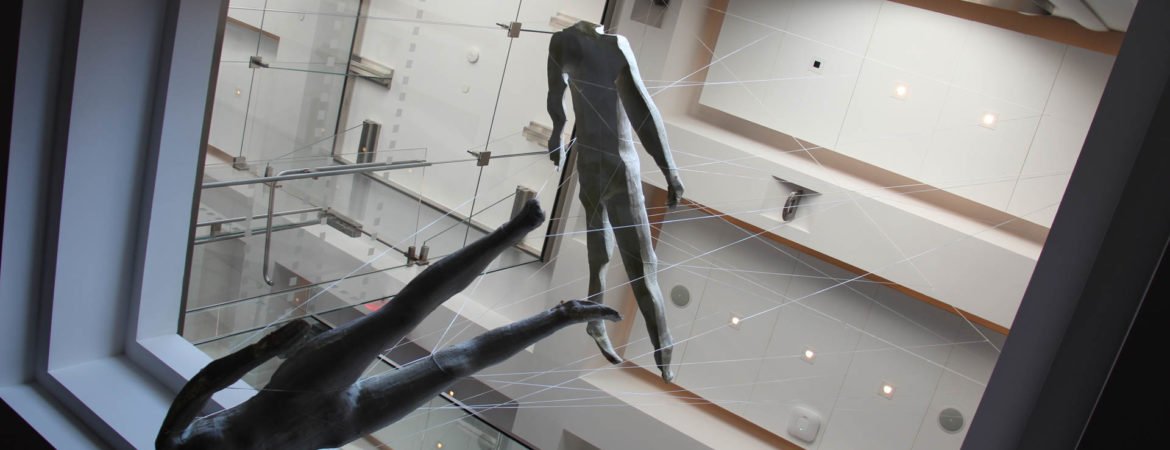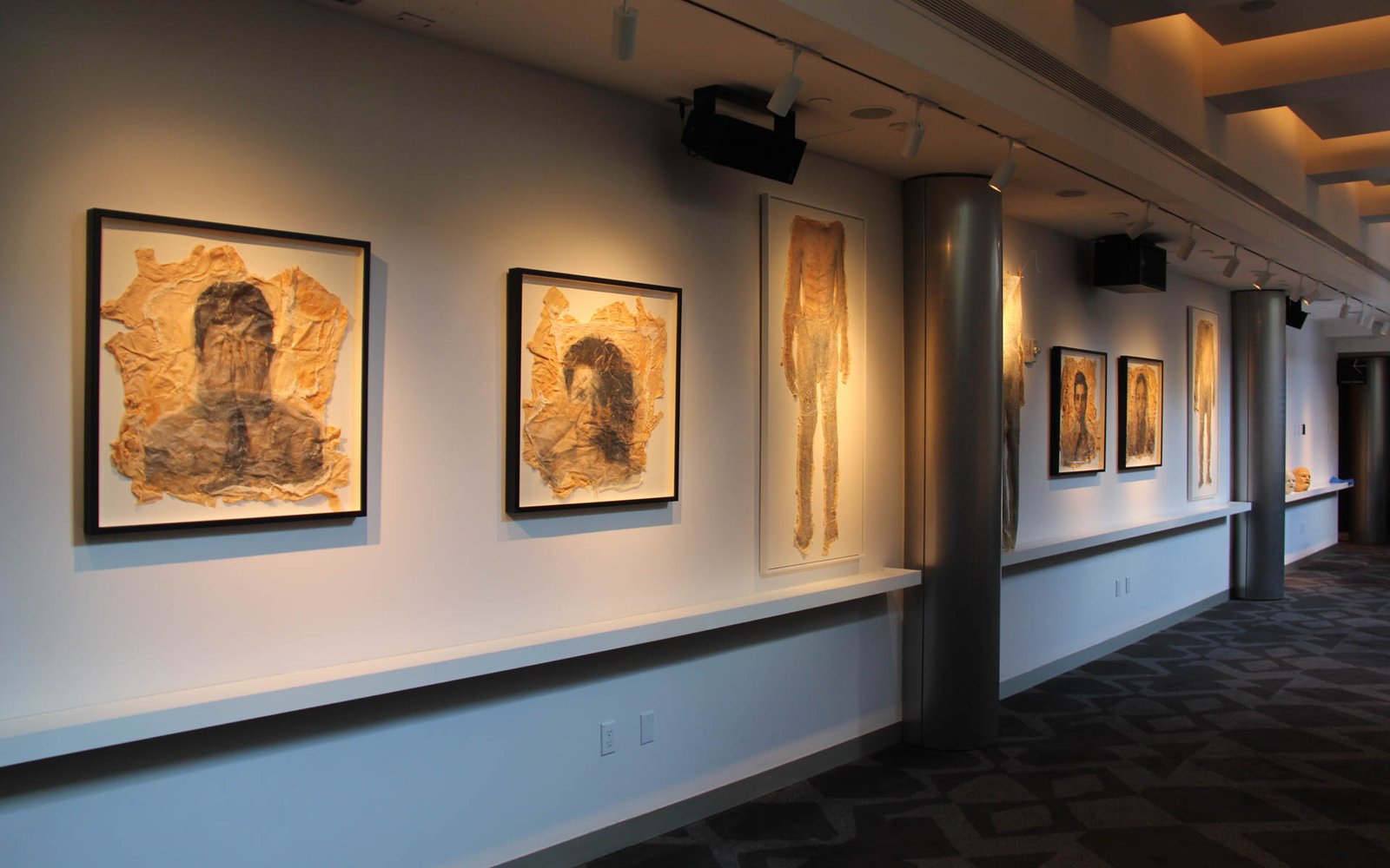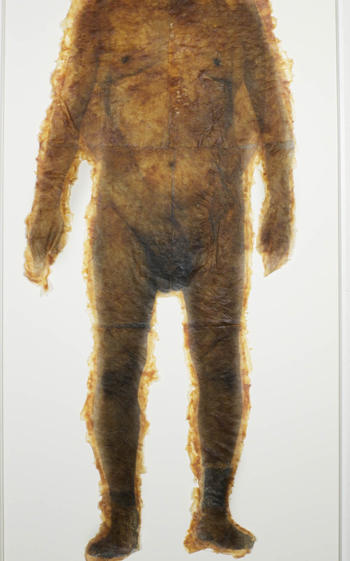 Becoming –Corpus Exhibition features re-purposed historical fragments of earlier iterative processes as well as leftover detritus of the creative process. Photographed bodies are printed onto latex skins from previous works by Garnica and Moriya. The skins are beheaded, on display not far from sculptures of the dancers’ heads, maybe in souvenir to a whole body. Other objects included are molds of Garnica and Moriya’s whole bodies entangled in string, appearing to hover in the air but also to anchor one’s vision. They use tension and suspension to conflate a sense of expansion and collapse of space. The same sense of dislocated space echoes the derangement of order in the choreography of Becoming –Corpus. The exhibition runs concurrently with the Becoming –Corpus stage production, functioning as both an independent exhibition and a complementary component of the project.