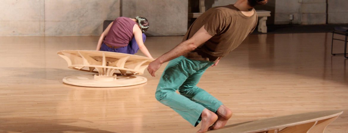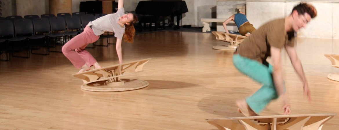 Bodies on the Brink pairs four dancers of the LEIMAY Ensemble with four kinetic sculptures to explore the interplay between the materials of body and sculpture, revealing the physics of causality and metaphoric potential for interconnectivity. This 15 minute score can be looped up to 4 times in a row or can be performed over the course of a full day with pauses. The work utilizes sonic sculptures with wireless mics that respond to the friction of performance.