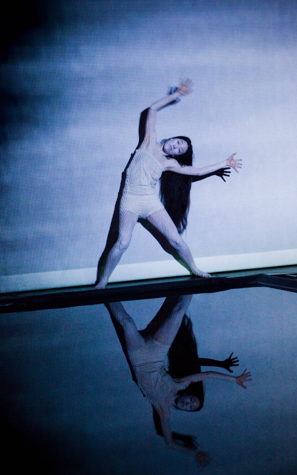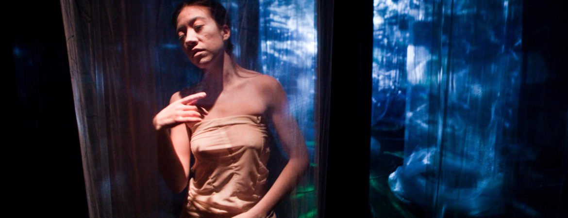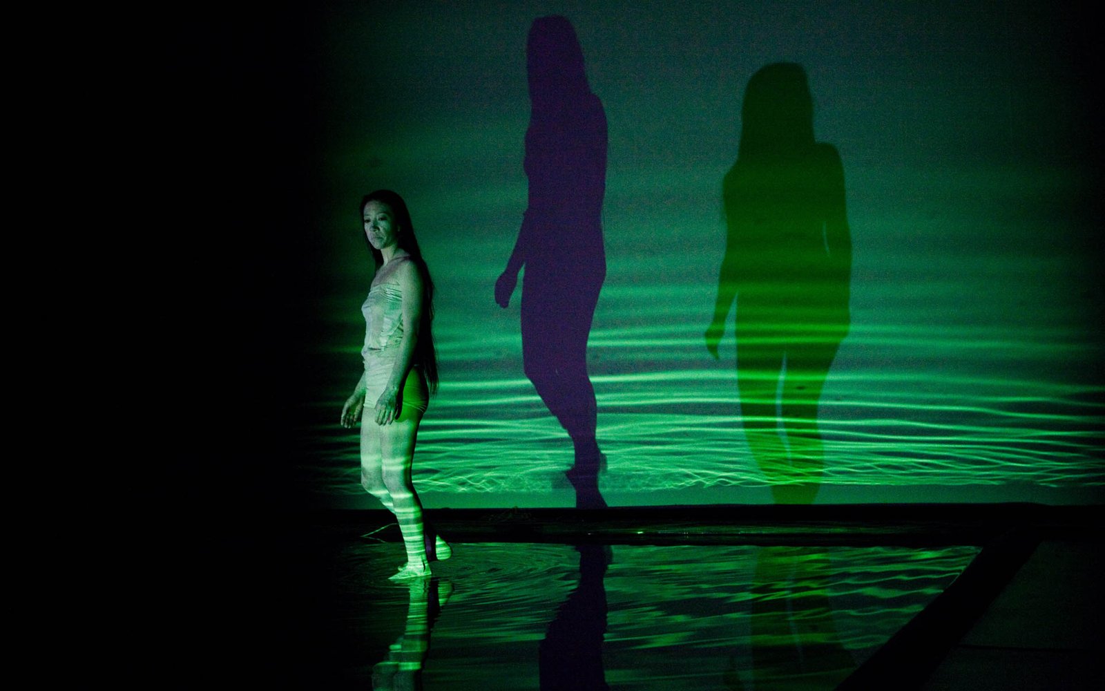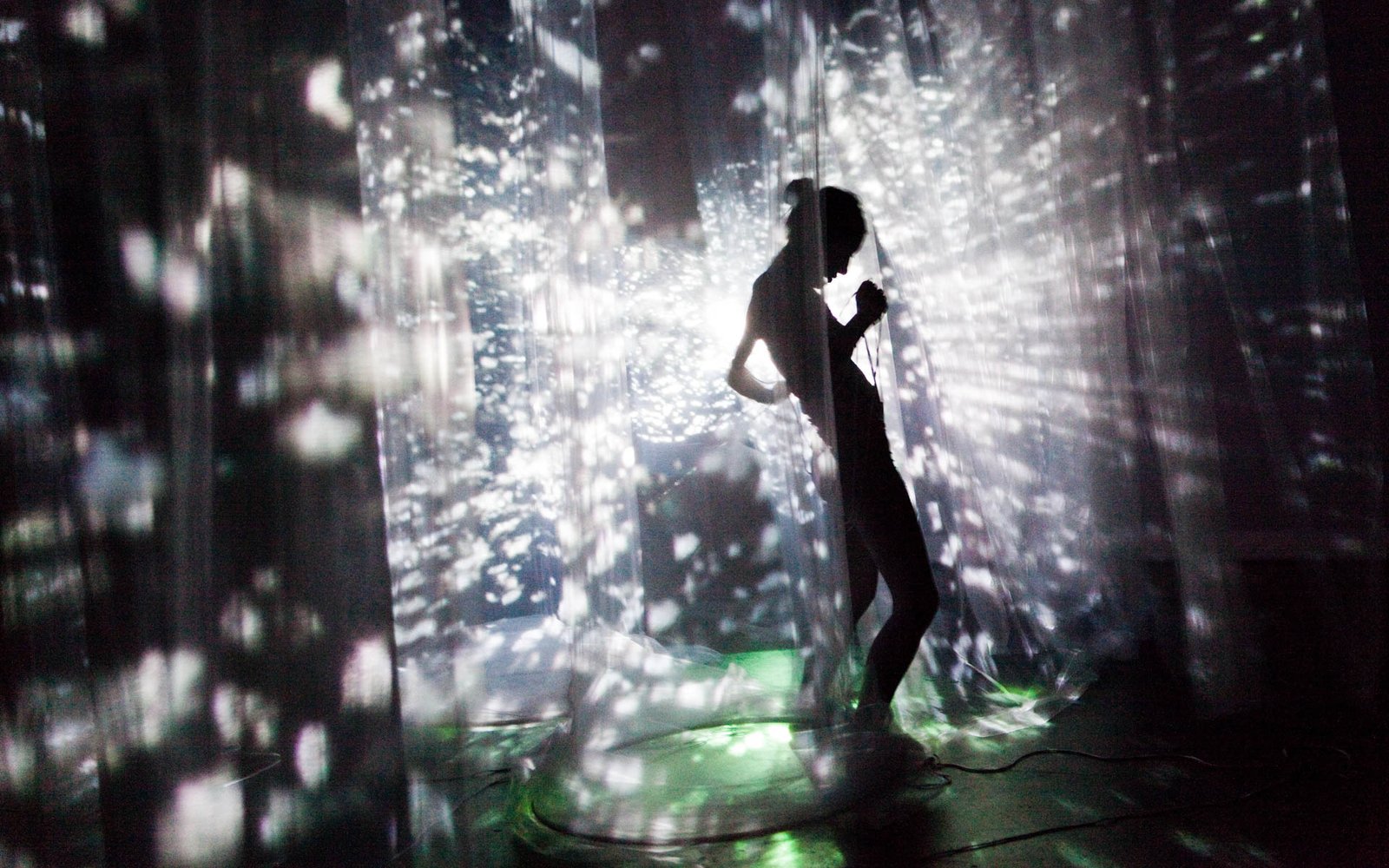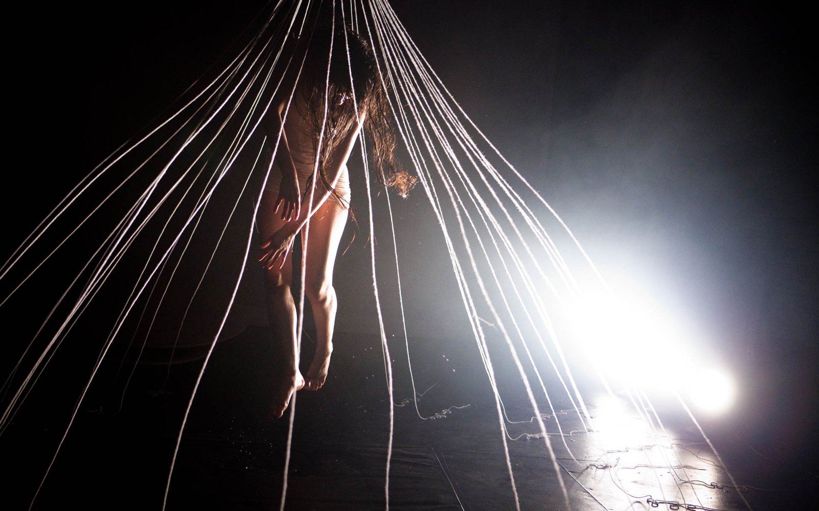 In Floating Point Waves, an installation of strings, water, dance, video, and live electronic music converge in a stunning seamless landscape. The audience is immersed in a mesmerizing space where the human body and basic elements fuse. The 55 minute long solo performance happens in three different environments: a pool of water that covers most of the stage, a series of kinetic sculptures with strings, and a group of fabric sculptures with projected images.