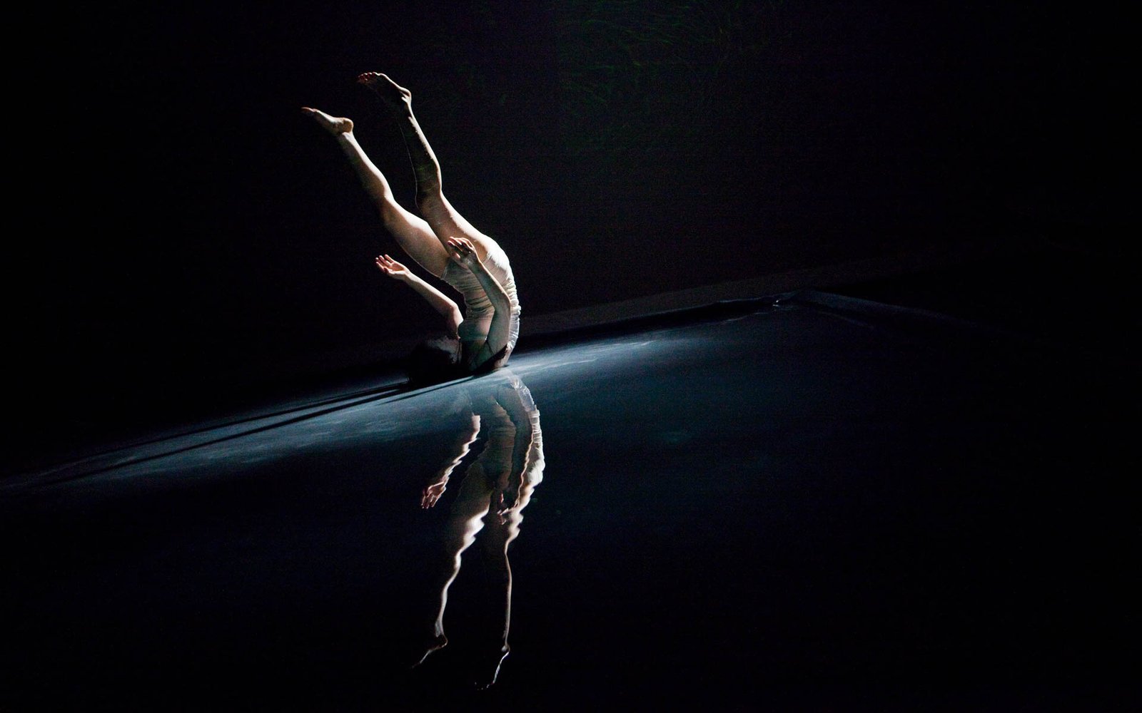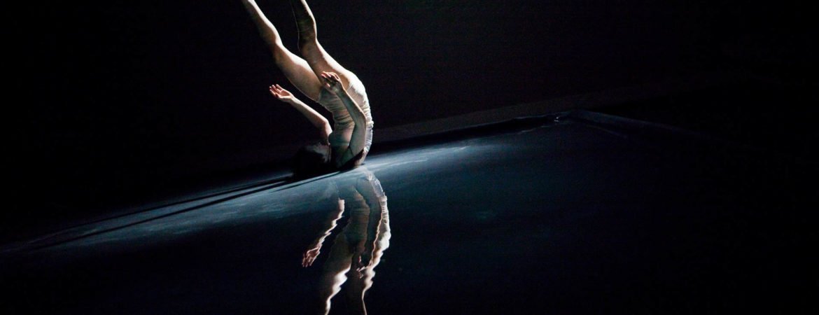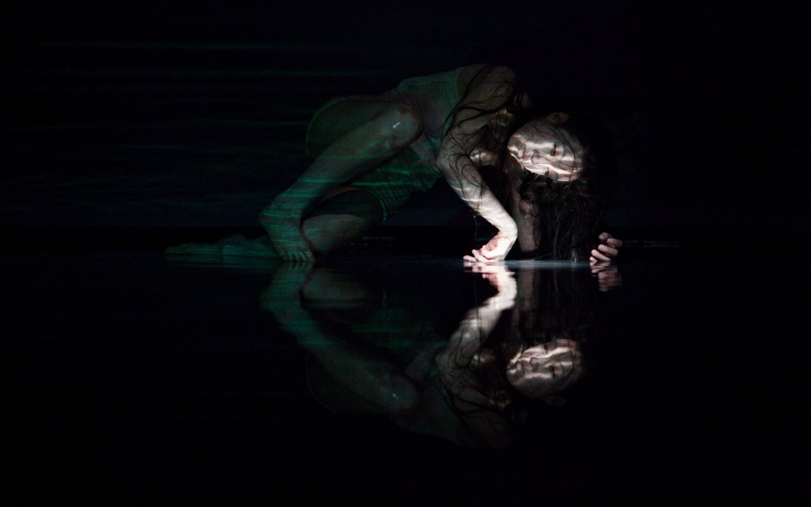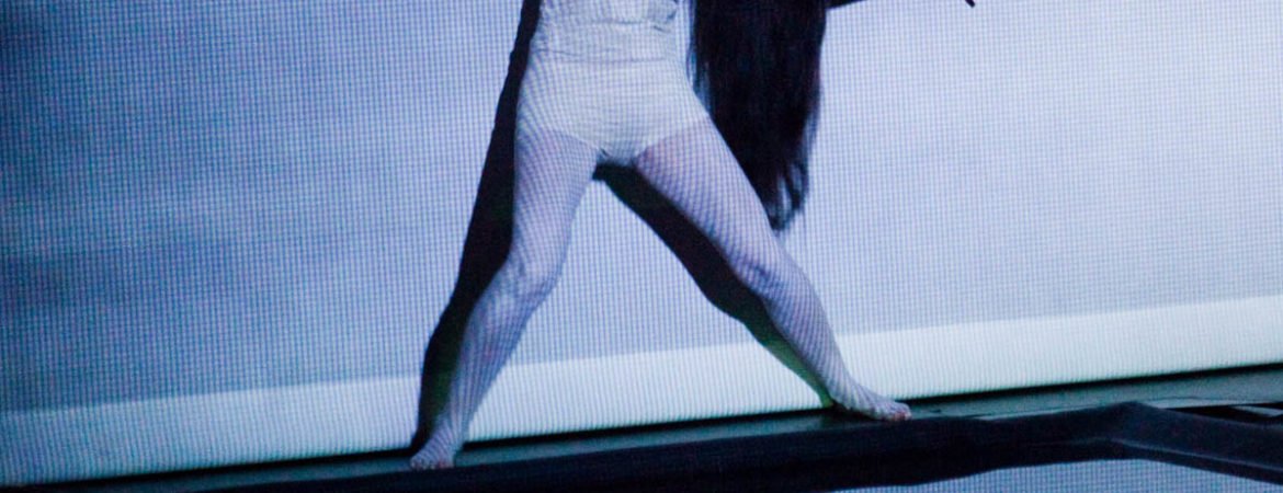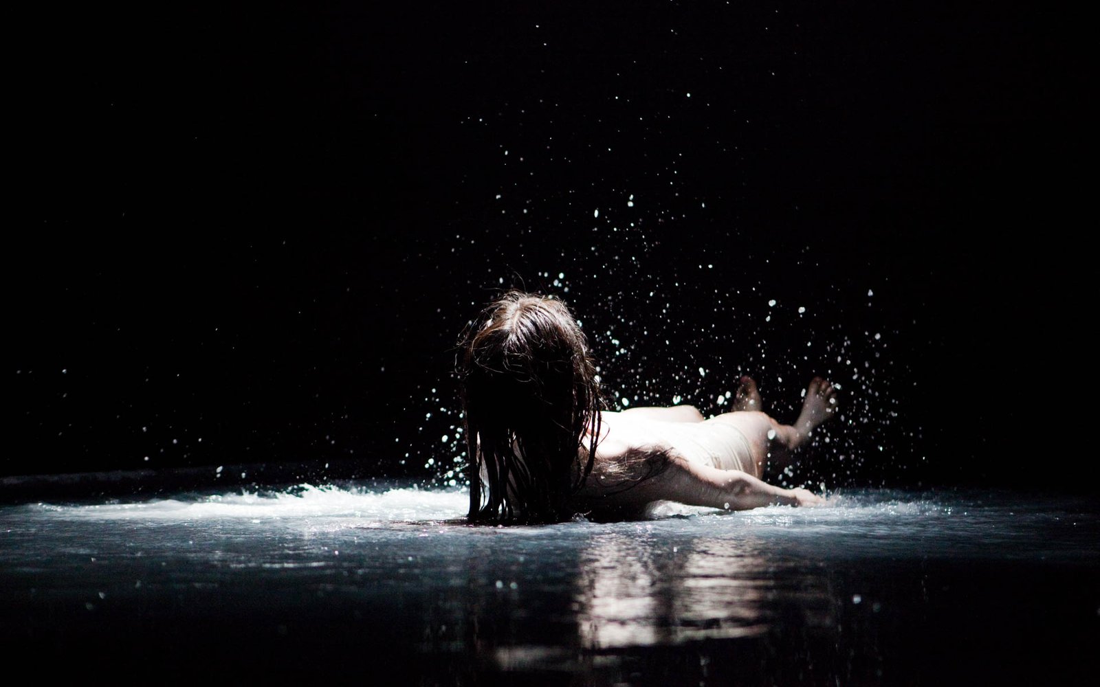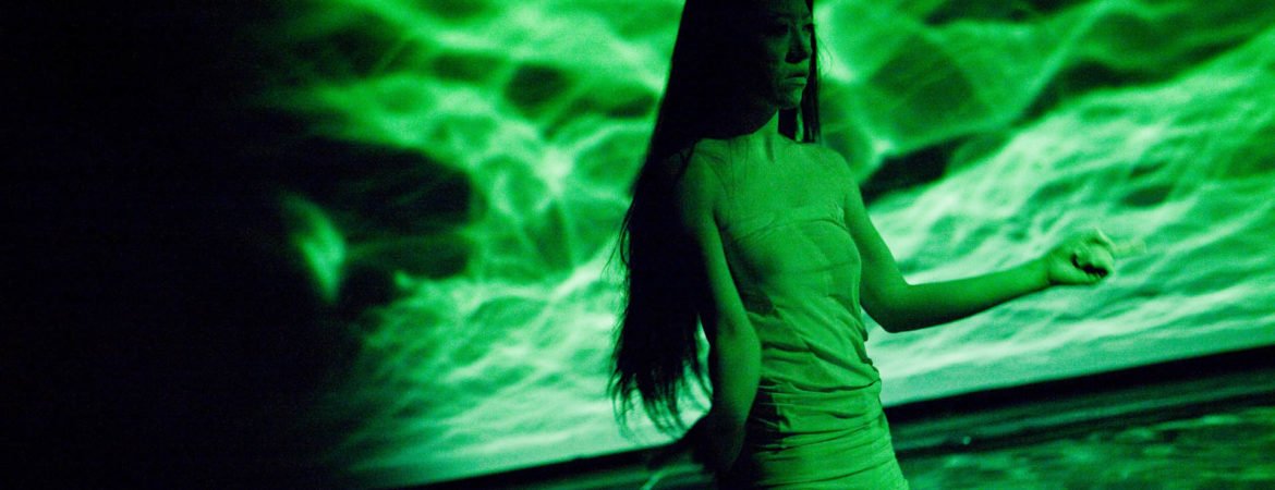 In Floating Point Waves, an installation of strings, water, dance, video, and live electronic music converge in a stunning seamless landscape. The audience is immersed in a mesmerizing space where the human body and basic elements fuse. The 55 minute long solo performance happens in three different environments: a pool of water that covers most of the stage, a series of kinetic sculptures with strings, and a group of fabric sculptures with projected images.